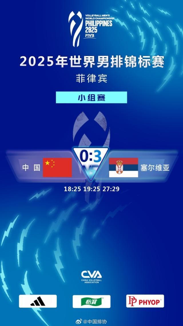 男排世锦赛小组赛第二轮,中国男排0比3不敌塞尔维亚,小组赛遭遇两连败基本出局。三局比分:18比25、19比25、27比29此前的小组赛第一轮,中国男排1比3不敌世界第3的巴西男排。中国队将于周四晚21:00迎来小组赛的最后一个对手捷克队。目前,巴西两战全胜积6分,塞尔维亚与捷克1胜1负积3分,中国队2负暂积0分。
