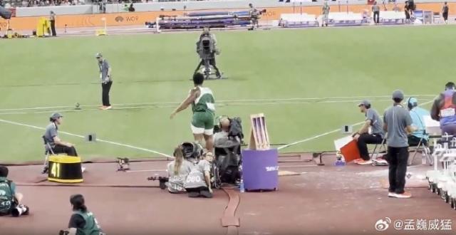 世锦铅球决赛中,尼日利亚选手扔出的铅球差点砸中裁判头部