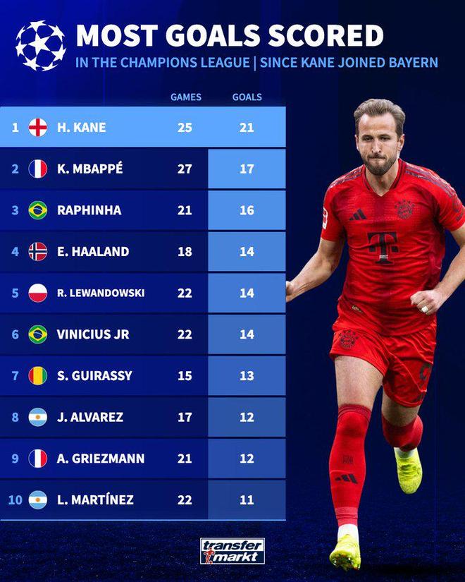 雷速体育9月18日讯 据德转数据统计,自2023年加盟拜仁慕尼黑以来,凯恩已经在欧冠打入了21粒进球,同期没有球员能达到如此成就。姆巴佩和拉菲尼亚分别以17、16球名列第二及第三。