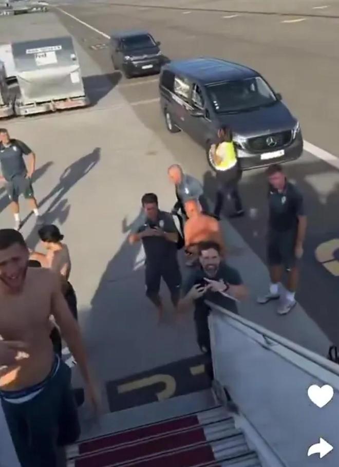 摩纳哥的球员们被迫裸着上身走下飞机,因为他们的航班被取消,无法按照计划前往参加他们的欧冠首场比赛。