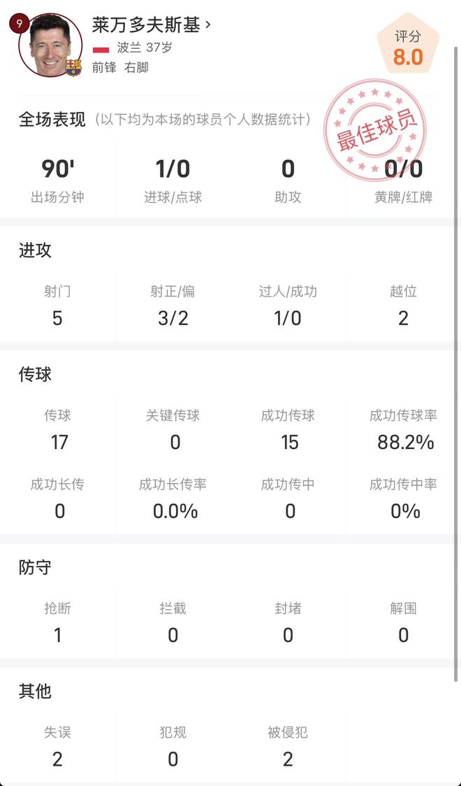 雷速体育9月29日讯 西甲第7轮,巴塞罗那在主场以2-1的比分战胜皇家社会。莱万多夫斯基发挥出色。