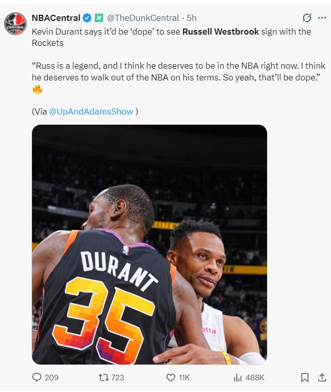 KD的言论至少能证明,他在互联网上听到一些消息说威少可能加盟火箭,他自己也愿意再度跟威少联手,而且杜兰特认为威少应该由自己来决定是否留在NBA打球或离开NBA,不该是这个联盟主动抛弃威少。