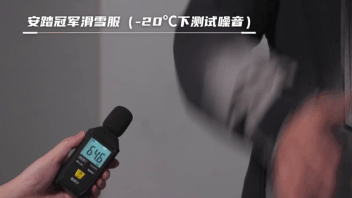 在面料舒适度测试实验中,模特分别穿着安踏冠军开山雪服V3和其他主流品牌滑雪服在-20℃的寒冷环境中模拟滑雪动作带够10分钟,并用分贝仪测试衣服所发出来的噪声。在分贝60dB左右的室外环境中,通过运动对比发现,安踏冠军开山雪服V3即便在寒冷环境中也不会变太“吵”,质地依然柔软!