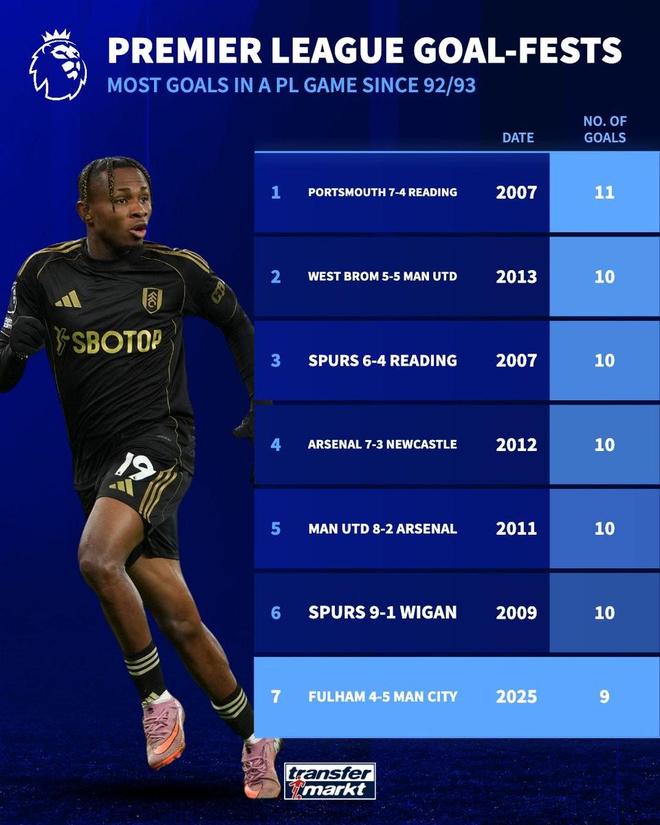 英超第14轮,曼城客场5-4险胜富勒姆,据统计,这是英超历史上第七高的比分,只有6场比赛的进球数比这场比赛更多。